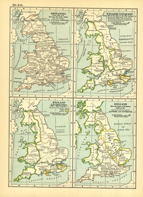 Britannia about 850 A.D. English Conquest From 450 to the End of the 6th Century. England in the Eigth Century. England after the Peace of Wedmore, 878 A.D. Showing the Division between Alfred and Guthrum.