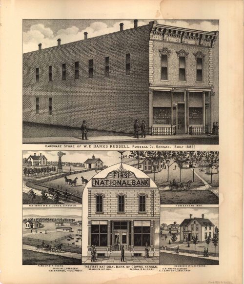 L.H. Evert’s 1887 Map of Hardware Store of W.E. Banks Russell / Farm of S. R. Young / Residence of S. R. Young / First National Bank of Downs, Kansas