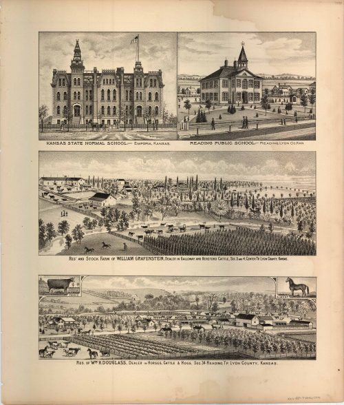 L.H. Evert’s 1887 Map of Kansas State Normal School / Reading Public School / Res. and Stock Farm of William Grafenstein / Res. of W.M. H. Douglass