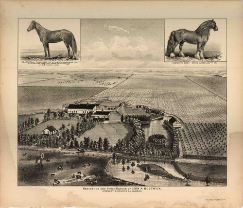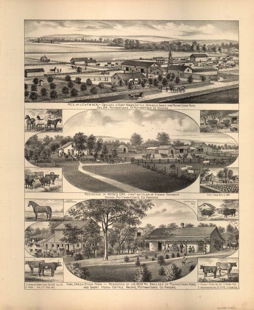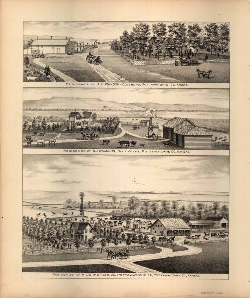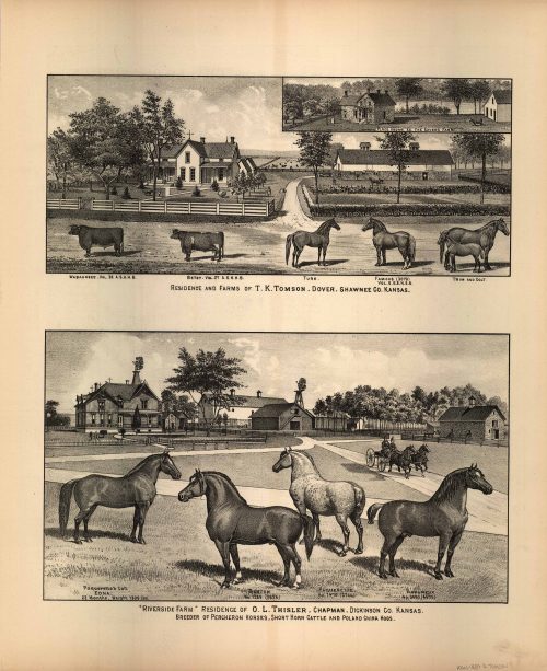 L.H. Evert’s 1887 Map of Residence and Farms of T. K. Tomson, Dover, Shawnee Co. Kansas / “Riverside Farm” Residence of O. L. Thisler, Chapman, Dickinson Co. Kansas