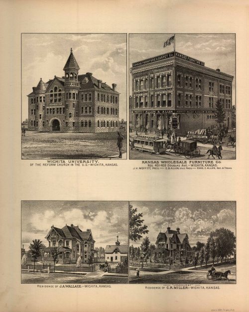 L.H. Evert’s 1887 Map of Wichita University. / Kansas Wholesale Furniture Co. / Residence of J. A. Wallace / Residence of C. R. Miller