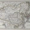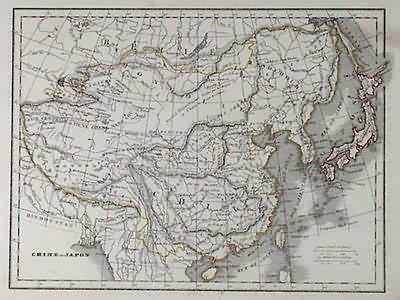 E. V. Monin made the “Atlas Universel de Geographie Ancienne & Moderne en 42 Cartes” circa 1822 in Paris. Bright colors highlight regions on these small, but detailed maps. This hand colored, French map illustrates China and Japan. The names of regions, important cities, mountain ranges, lakes and rivers are identified. These old maps are in very good condition with unique outline coloring.