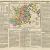 Brightly-colored copper-plate map of China, surrounded by textual information regarding geography, history, political divisions, and religion.
