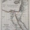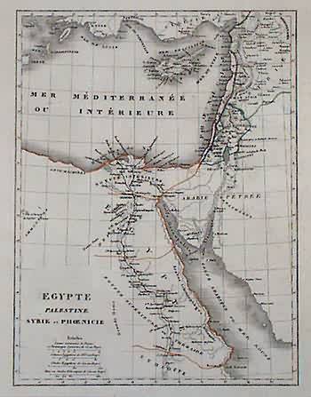 E. V. Monin made the “Atlas Universel de Geographie Ancienne & Moderne en 42 Cartes” in 1822 in Paris. Bright colors highlight regions on these small, but detailed maps. This hand colored, French map illustrates Egypt and Palestine. The names of regions, important cities, mountain ranges, lakes and rivers are identified. These old maps are in very good condition with unique outline coloring.