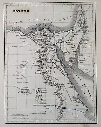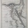 E. V. Monin made the “Atlas Universel de Geographie Ancienne & Moderne en 42 Cartes” circa 1822 in Paris. Bright colors highlight regions on these small, but detailed maps. This hand colored, French map illustrates Egypt. The names of regions, important cities, mountain ranges, lakes and rivers are identified. These old maps are in very good condition with unique outline coloring.