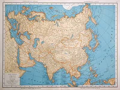 The 1936, sixty-seventh edition of the “Rand McNally Commercial Atlas and Marketing Guide” is unique in its inclusion of informative details. Each map is brightly colored; predominantly in orange and tan with blue oceans, lakes and rivers. Asia is illustrated on this large, double page map. The names of regions, states, important towns, lakes, rivers and major geological features are labeled.