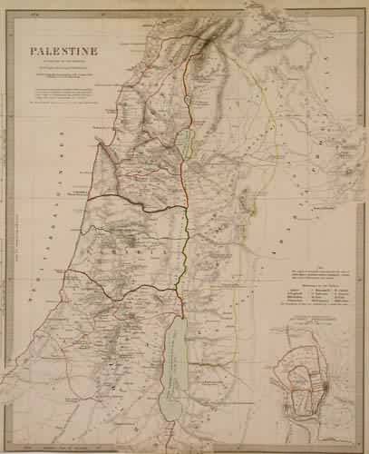 This finely detailed map was published in 1844 by the Society for the Diffusion of Useful Knowledge, a British philanthropical group. Cities, towns, regions, rivers and mountain ranges are illustrated. Copper plate engraved with original hand outline coloring. Included is an inset map of Ancient Jerusalem