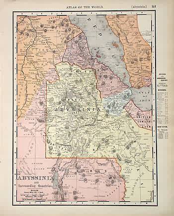 This map came from Rand McNally’s Universal Atlas printed in 1895. This is a detailed map of Abyssinia and surrounding countries. Major cities, rail lines and rivers are shown. Countries are distinguished by yellow, red, orange and blue..