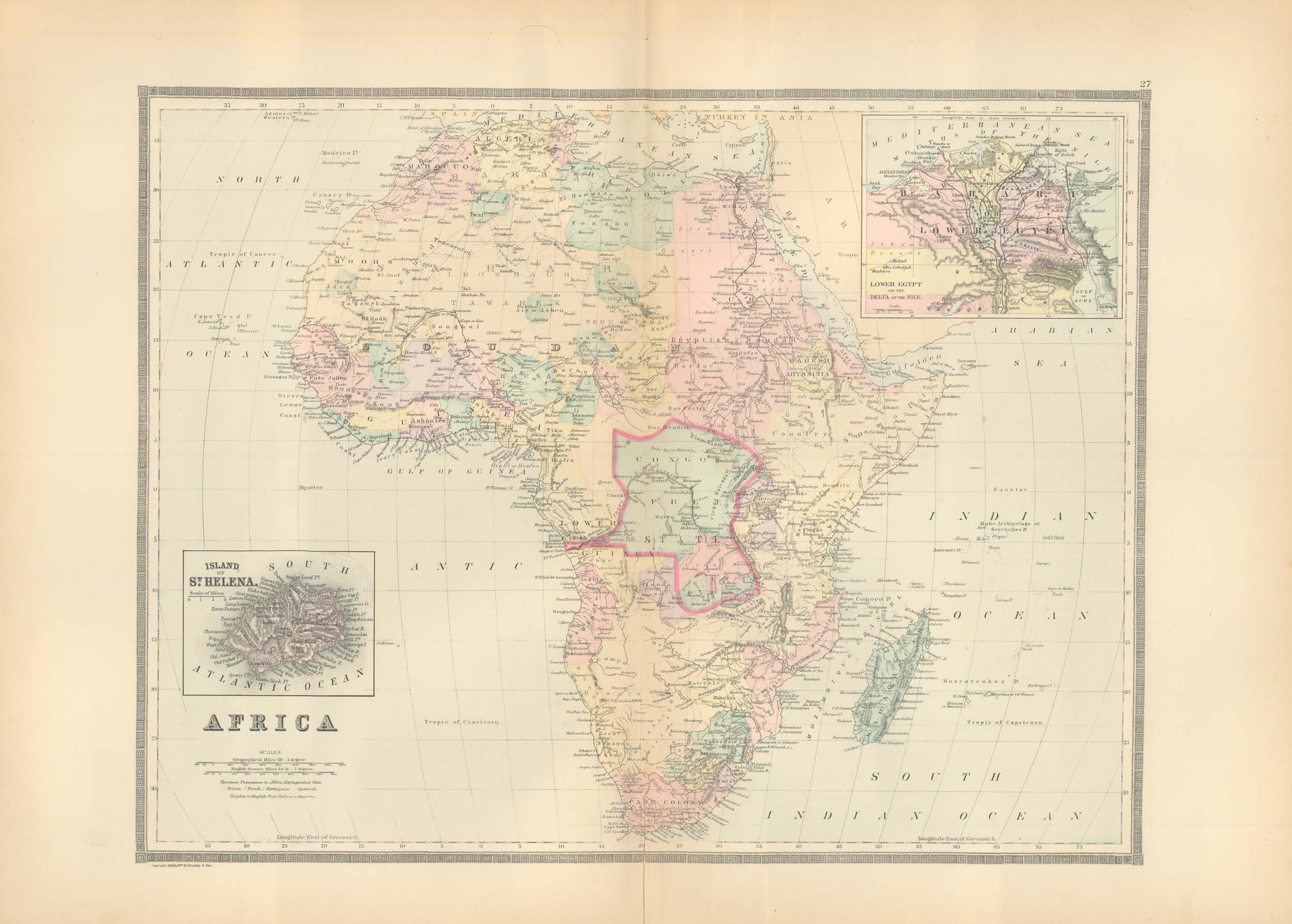 This beautiful, hand colored, steel plate engraved map of Africa was made by William Bradley & Bros. in 1889. Pastel color distinguishes regions on this very detailed map from the hard to find map-maker. Countries, states, important cities, rivers, lakes, and mountain ranges are identified on the map. Insets show St. Helena and the vicinity of the Delta of the Nile.