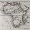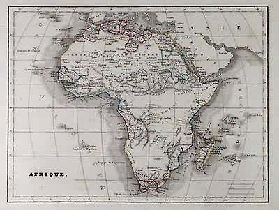 E. V. Monin made the “Atlas Universel de Geographie Ancienne & Moderne en 42 Cartes” circa 1822 in Paris. Bright colors highlight regions on these small, but detailed maps. This hand colored, French map illustrates Africa. The names of regions, important cities, mountain ranges, lakes and rivers are identified. These old maps are in very good condition with unique outline coloring.