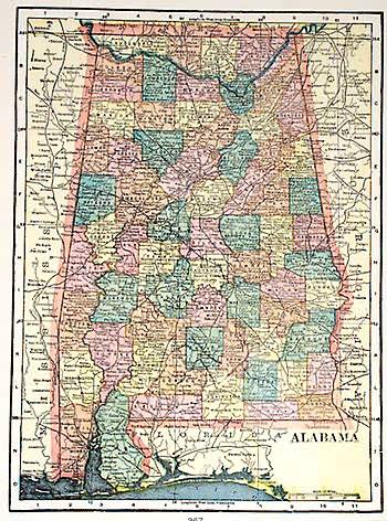 This map was produced for the “Monarch Standard Atlas” , by J.Martin Miller in 1905. Alabama is illustrated on this map, with a list of counties and chief cities to the right of the map. Counties are distinguished by color. Other details include illustrations of lakes, rivers,and mountains. The atlas proclaimes that it offers “complete, original and authentic maps of the present developement of all the countries, empires and states of the world comprising a graphic description of the people: their civilization, their religion, their government, their cities, their important exports, their wealth, their railways, their canals, their cables, their telegraphs, ect., including a description of their climate, the productions, the rivers, the valleys, the lakes, the mountains, the minerals, the glaciers, and every other subject of interest to the american people.”