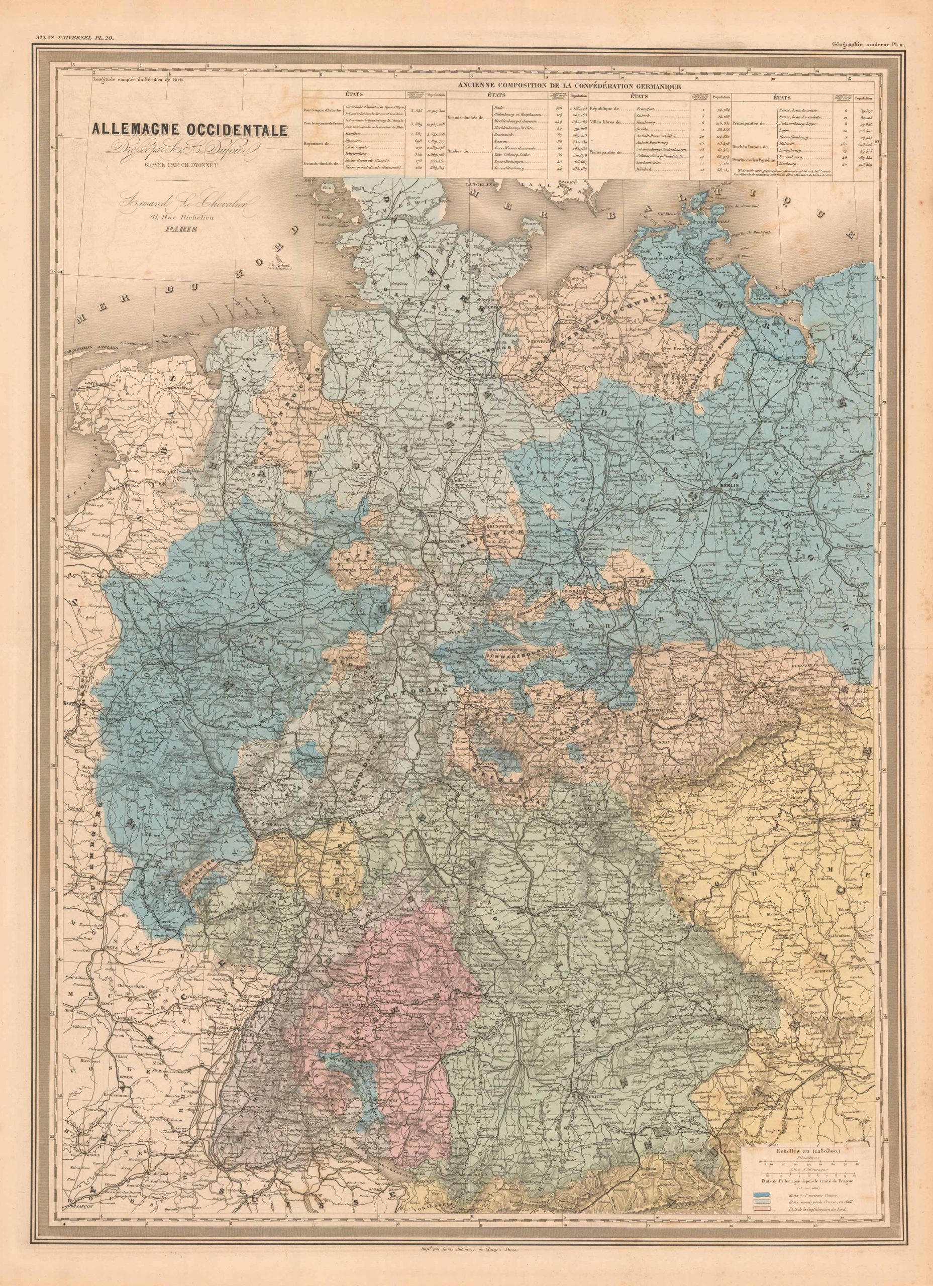 At the height of 19th century cartography, comes the work of H. Dufour. In Dufour’s work, we see a consummate example of French steel-engraving at the time, with its rich ability to depict texture as well as detail, and here, portraying the latest in geographic information. These uncommonly large maps, are the state of the art for the time, and convey a strong sense of the French aesthetic at the time, with a wealth of detail shown in a clean, articulate and ornate fashion. These are unique maps with a large stately presentation, and rich original hand color. These very detailed maps show cities and towns, lakes and rivers, topographical features, as well as numerous other details.