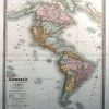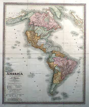 This beautiful hand colored map was made in 1836 by C.F.Weiland in Germany. The Americas are illustrated on this map. Details include identification of North and South America, countries and important cities, and illustrations of rivers and lakes. Countries and territories are distinguished by bright colors.