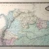 M. F. A. Garnier made the “Atlas de Geographie” in 1862. The maps in this atlas would frame nicely due to their extraordinarily beautiful hand coloring and title plates and their large margins. Colombia, Venezuela, Equador and parts of Brazil and Peru are illustrated on this map with pastel coloring. The names of regions, possessions, important cities, island chains, mountains, rivers and lakes are identified in French.