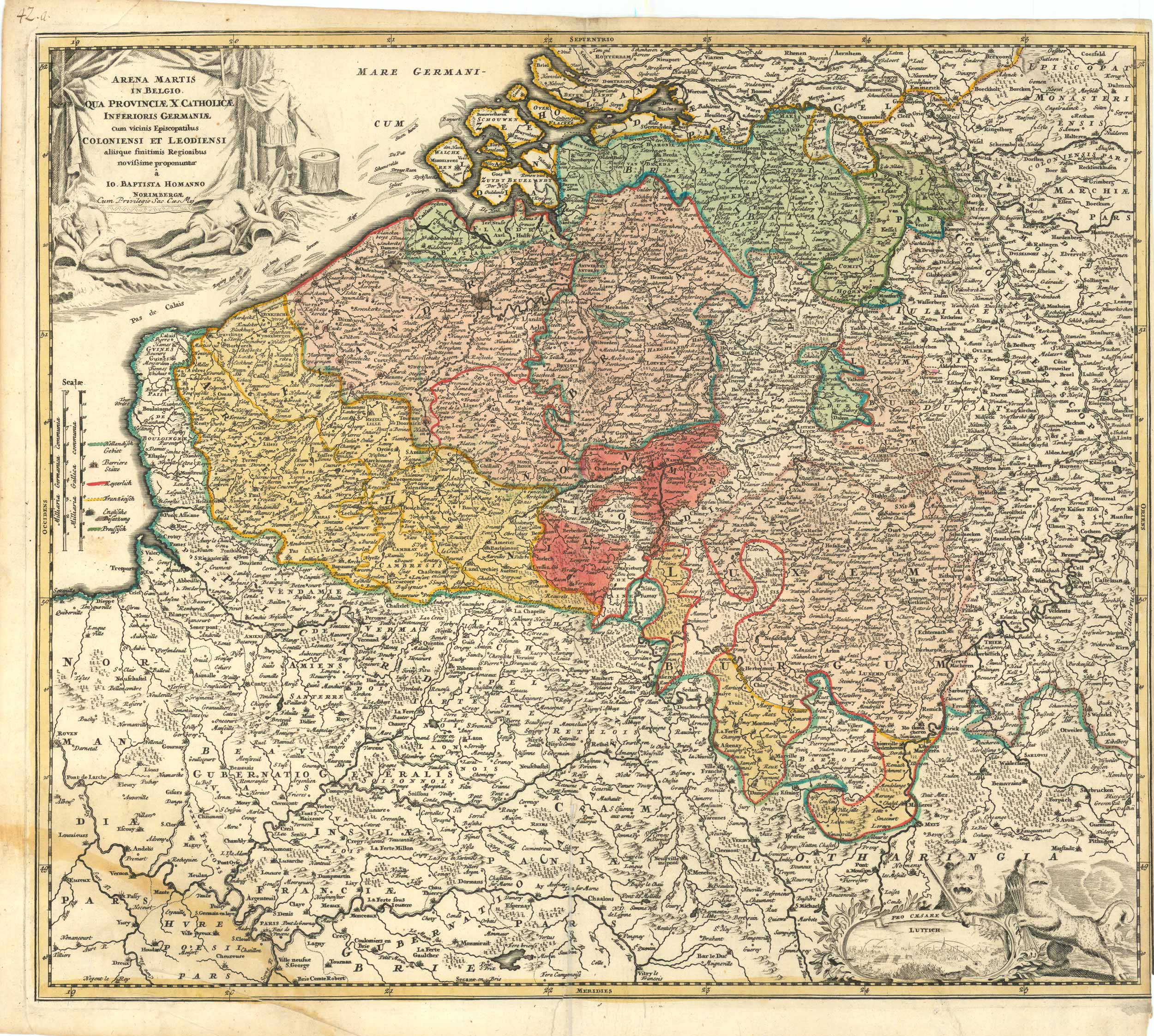 This map titled “Arena Martis in Belgio Qua Provinciae X Catholica Inferioris Germania” is a historical cartographic work attributed to Johann Baptist Homann, a renowned German geographer and mapmaker of the early 18th century. This map depicts a region of the Low Countries, specifically focusing on the ten Catholic provinces of the Southern Netherlands, which correspond to present-day Belgium and parts of Northern France. The title, “Arena Martis,” or “Field of Mars,” suggests a land often marked by conflict—apt for a region that was a frequent battleground in European wars of the time. This title is roughly translated “The Field of Mars in Belgium, where the ten Catholic provinces of Lower Germany, together with the neighboring bishoprics of Cologne and Liège and other nearby regions, are newly presented by Johann Homann.”
