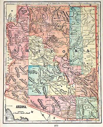 This map was produced for the “Monarch Standard Atlas” , by J.Martin Miller in 1905. Arizona is illustrated on this map with a list of counties and chief cities to the right of the page. Counties are distinguished by color. Other details include major roads,illustrations of lakes, rivers,national parks, and mountains. The atlas proclaimes that it offers “complete, original and authentic maps of the present developement of all the countries, empires and states of the world comprising a graphic description of the people: their civilization, their religion, their government, their cities, their important exports, their wealth, their railways, their canals, their cables, their telegraphs, ect., including a description of their climate, the productions, the rivers, the valleys, the lakes, the mountains, the minerals, the glaciers, and every other subject of interest to the american people.”