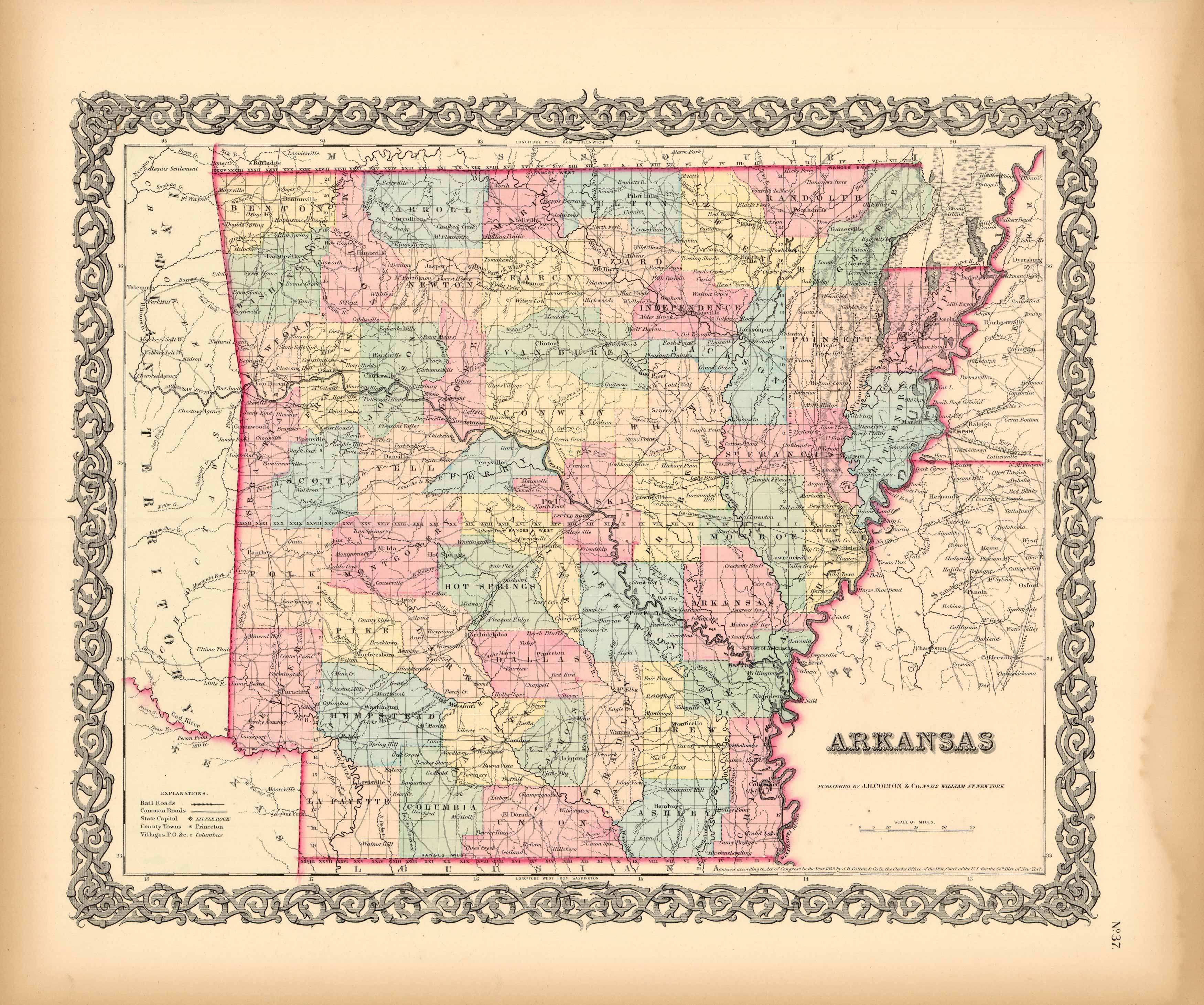 Art Source International is proud to offer this map of Arkansas from the 1856 edition of Coltons Atlas of the World. Colton atlases, especially those from the 1850’s, have become increasingly rare. The Colton maps were engraved by steel plates rather than by wax engraving, which was the most common method used at this time. These maps are very detailed in beautiful hand colored pastels, and feature Colton’s signature 3/4 inch border. This map shows cities, towns and villages, transportation routes, common roads, canals, rivers and lakes, and other geographical features.