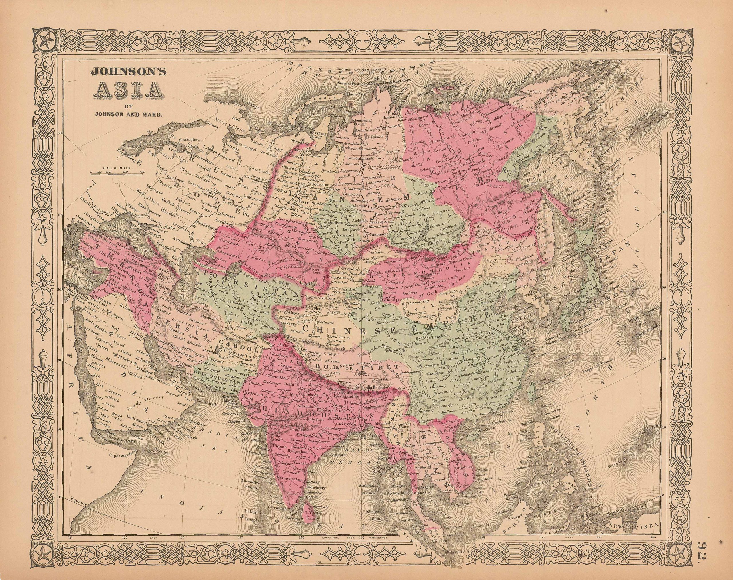 Near the forefront of the atlas publication industry for a quarter century was mapmaker and aggressive marketer Alvin Jewitt Johnson. Around 1860, in a transaction that remains somewhat mysterious, Johnson acquired a set of detailed plates from J.H. Colton, one of the foremost mapmakers of the century, and used them to print the Johnson atlas that was to find its way into homes across the country. Johnsons New Illustrated Family Atlas was first published in 1860, and today these maps have become prized collectibles and true works of cartographic art. The attention to detail and fine hand-coloring of these maps make them some of the best collectibles maps from the 19th century. This single-page map illustrates Asia. Countries, regions, cities, towns, common roads, and topographical features are noted.