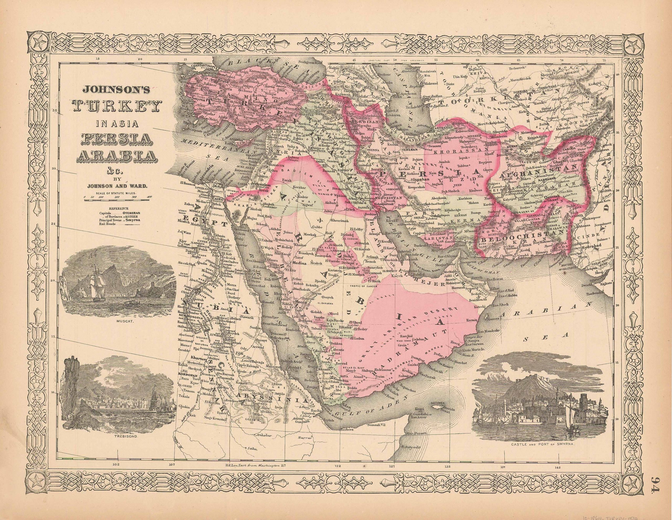 Near the forefront of the atlas publication industry for a quartercentury was mapmaker and aggressive marketer Alvin JewittJohnson. Around 1860, in a transaction that remains somewhatmysterious, Johnson acquired a set of detailed plates fromJ.H. Colton, one of the foremost mapmakers of the century, andused them to print the Johnson atlas that was to find its way intohomes across the country. Johnsons New Illustrated FamilyAtlas was first published in 1860, and today these maps havebecome prized collectibles and true works of cartographic art.The attention to detail and fine hand coloring of these mapsmake them some of the best collectibles maps from the 19thcentury. This signal page map illustrates Turkey in Asia, Persia and Arabia. Countries, cities, towns, rail roads, transportation routes and topographical features are noted. A very detailed and colorful map!’