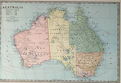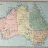 This map was produced for the “Monarch Standard Atlas” , by J. Martin Miller in 1905. Australia is illustrated on this map with divisions according to the governorship of the land. Main sea routes are identified. Other details include the names of important cities, deserts, lakes, rivers and mountains. The atlas states that it offers “complete, original and authentic maps of the present developement of all the countries, empires and states of the world comprising a graphic description of the people: their civilization, their religion, their government, their cities, their important exports, their wealth, their railways, their canals, their cables, their telegraphs, ect., including a description of their climate, the productions, the rivers, the valleys, the lakes, the mountains, the minerals, the glaciers, and every other subject of interest to the american people.”