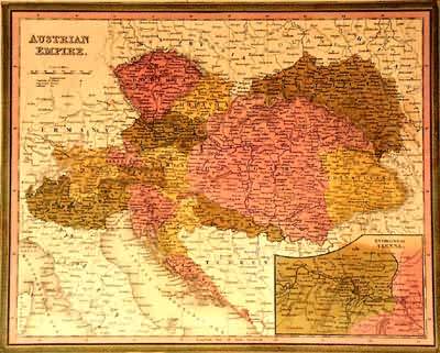 Art Source International is proud to present maps from Henry Schenk Tanners “New Universal Atlas”, a volume of work which in 1828 was hailed as a great advancement in the art and science of map-making. Tanner gained notoriety for this work and the one he published before it, his “New American Atlas.” Both were widely considered to be important contributions to early American cartography. This remarkable and rare map of the Austrian Empire was created for the 1836 edition of the “New Universal Atlas.” The unique look is framed by a sage and pink border that complements the original hand coloring in the image of the map. An inset highlights the Environs of Vienna and the different provinces of the Austrian Empire in 1860 are also given. Rivers, lakes, mountains ranges, towns and cities are all listed at one of the greatest degrees of accuracy for maps produced at this time. This map is a true american rarity!!!’