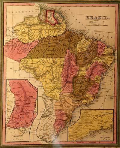 Art Source International is proud to present maps from Henry Schenk Tanner’s “New Universal Atlas”, a volume of work which in 1828 was hailed as a great advancement in the art and science of map-making. Tanner gained notoriety for this work and the one he published before it, his “New American Atlas.” Both were widely considered to be important contributions to early American cartography. This remarkable and rare map of Brazil was created for the 1836 edition of the “New Universal Atlas.” The unique look is framed by a sage and pink border that complements the original hand coloring in the image of the map. Two insets in the bottom corners of the map highlight the Environs of Rio Janeiro and the region of Paraguay. The different provinces of Brazil in 1860 are also given. Rivers, lakes, mountains ranges, towns and cities are all listed at one of the greatest degrees of accuracy for maps produced at this time. This map is a true american rarity!!!