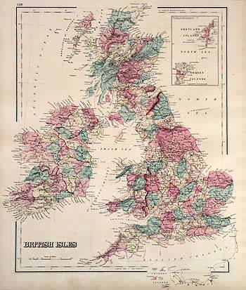 This hand colored map was made for “Grays Atlas of the United States” by O.W. Gray in 1874. The British Isles are illustrated on this map. An inset shows the Shetland and Orkney Isles. Counties are distinguished by bright pastel color. Other details include the names of counties, countries, and important cities, rivers, mountains, and railroads.