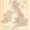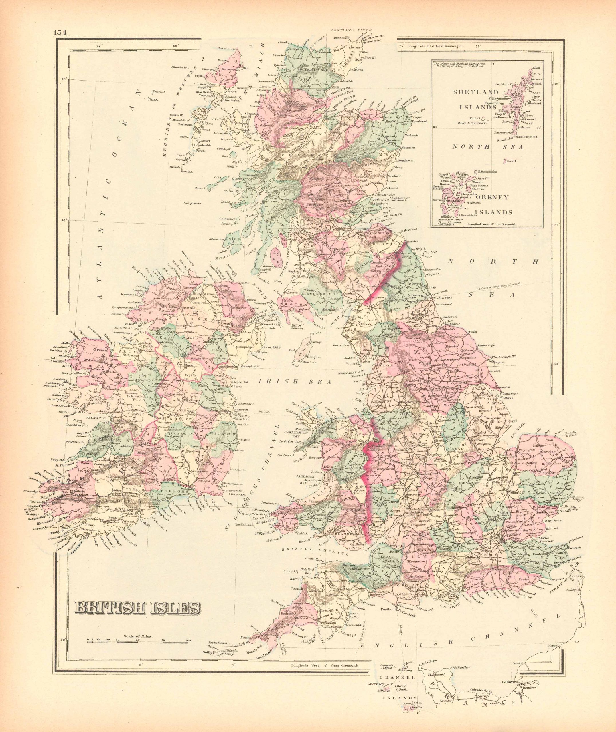This hand colored map was published by O.W. Gray in 1879. The British Isles are illustrated on this map. Details include counties distinguished by vibrant pastel color, waterways, railroads, and the names of important cities. This map is remarkably well preserved with exceptionally bright hand-coloring.