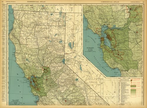 The 1936, sixty-seventh edition of the “Rand McNally Commercial Atlas and Marketing Guide” is unique in its inclusion of informative details concerning population sizes, district uses, the size of counties, and railroad routes. Cities and their populations are listed beside the map. Each map is brightly colored; predominantly in green and tan with blue oceans, lakes and rivers, and brown coloring of high density metropolitan areas. California is illustrated on this large map with insets of the vicinities of San Francisco, and San Diego. The names of states, counties, important towns, lakes, rivers and mountain ranges are labeled. A list of state railroad lines is provided on the map.