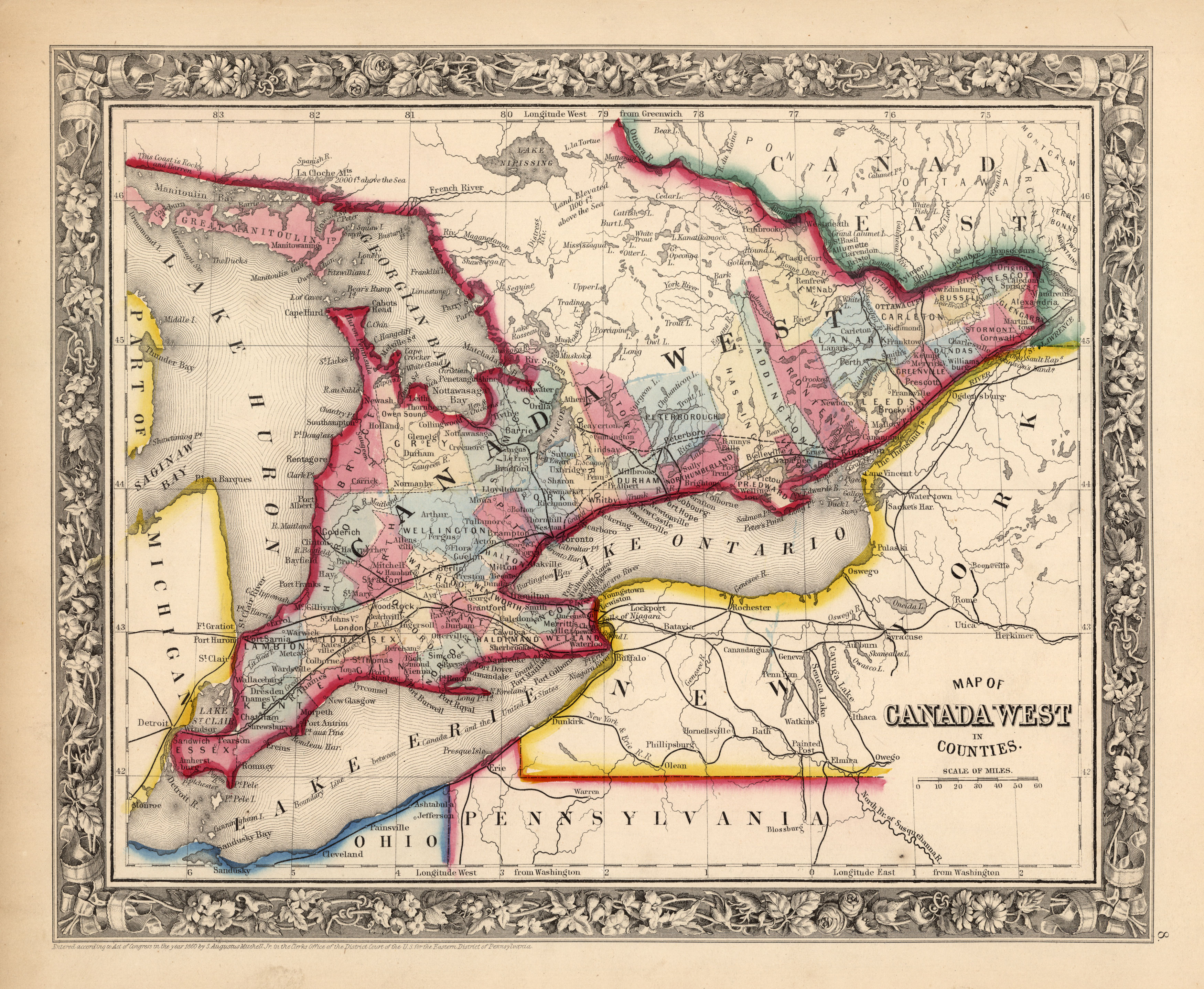 The Mitchell company was one of the first to try out the new technique of engraving on steel plates, experimenting with steel almost 20 years before the rest of the publishing industry. He was printing with steel in the early 1830s; the general switch to steel engraving was approximately 1850. During the early years of the company, Mitchell published mainly maps and travel guides. In 1860, Mitchell started producing “Mitchell’s New General Atlas”. Mitchell Sr. retired and turned the business over to his son of the same name. The New General Atlas was published until 1893. Today Mitchell maps are sought after for their fine engraving, bright coloring, and attention to detail. They are some of the finest maps produced in the 1860’s. This map, produced in 1863, shows Mitchell’s famous flower border, which is only seen in the early editions of his atlases. This map shows western Canada.