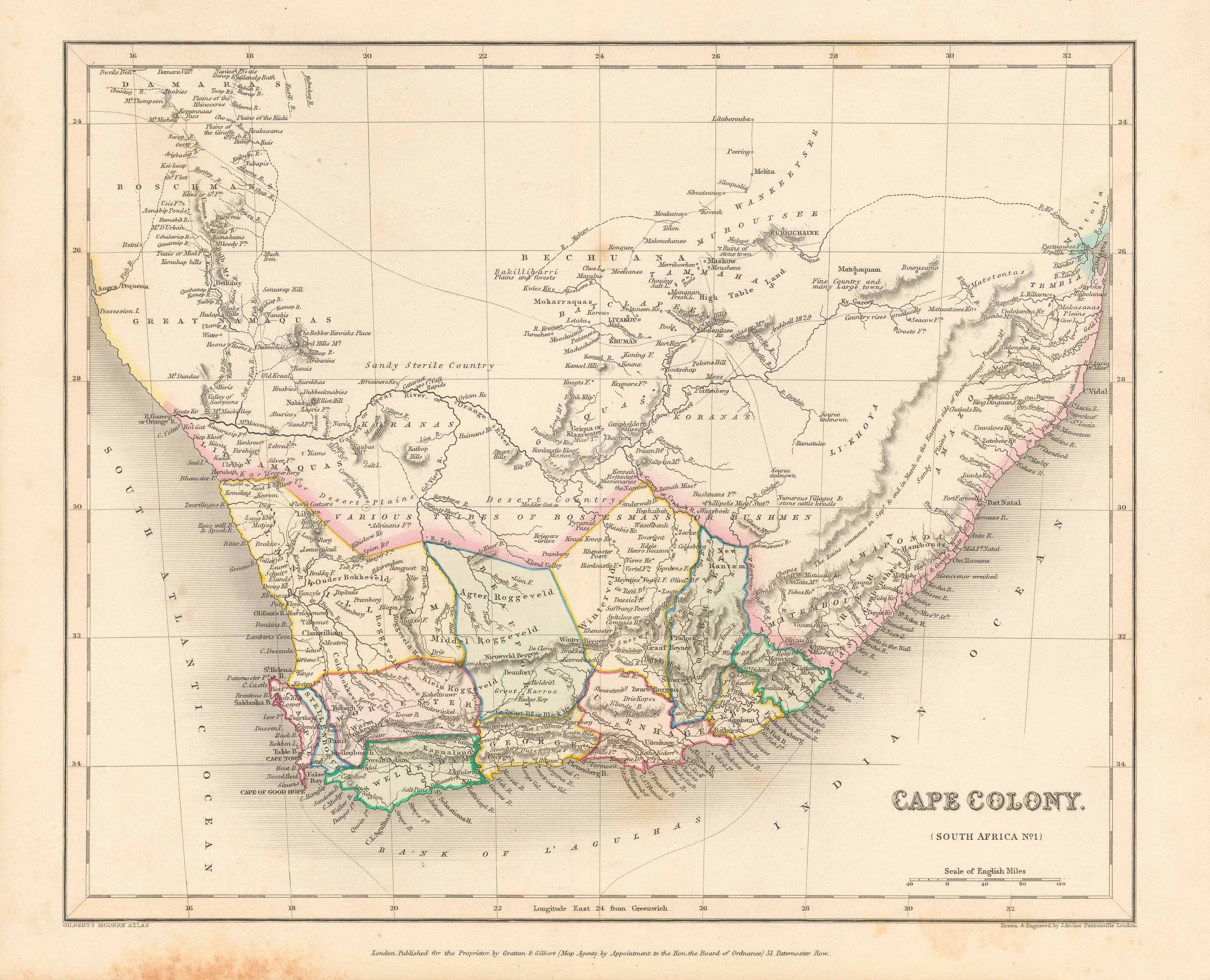 We are proud to offer this very rare map of Cape Colony by James Gilbert. This map was issued in 1840 as part of Gilbert’s Modern Atlas of the Earth. In our over 40 years in the antique map business, it is difficult to remember any finer maps than these. The coloring is exquisite, the engraving is exceptional, and the paper quality is extraordinary.