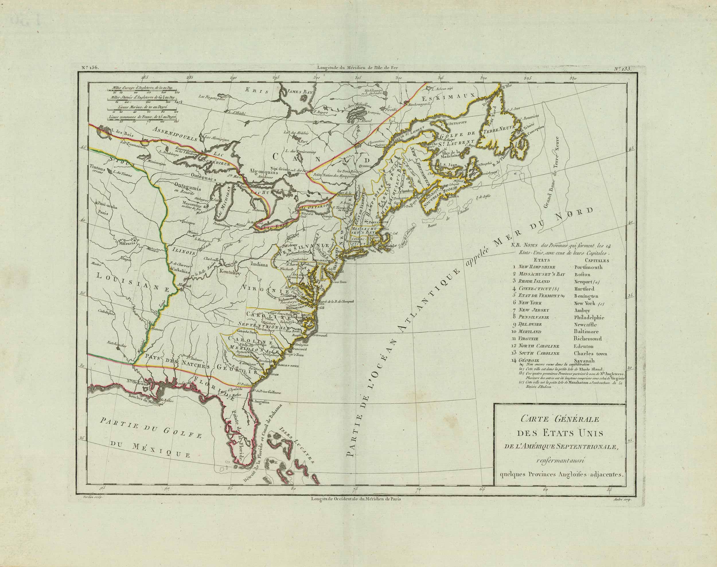 In 1798 this map titled “Carte Generale Des Etats Unis, de L’Amerique Septentrionale, renfermant aussi quelques Provinces Angloises adjacente s” was published, offering a detailed depiction of the eastern half of the United States and Canada. This map was the result of a collaboration between cartographers Pierre François Tardieu, Pierre Gregoire Chanlaire, and Edme Mentelle, and it reflects the geopolitical landscape of the post-Revolutionary War era. This map was produced during a time of significant change and interest in North America. This map shows an interesting chart of the 14 states and their capitals. The United States had recently gained independence, and European powers were keenly interested in the political and geographic developments of the new nation. Maps like this served not only as navigational tools but also as instruments of political and economic insight.