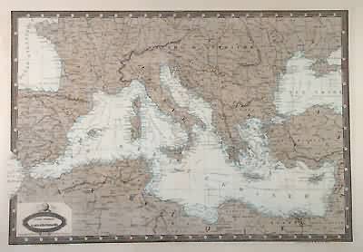 M. F. A. Garnier made the “Atlas de Geographie” in 1862. The maps in this atlas would frame nicely due to their extraordinarily beautiful hand coloring and title plates and their large margins. The Mediterranean and surrounding countries are illustrated on this map with pastel coloring. The names of regions, possessions, important cities, island chains, mountains, rivers and lakes are identified in French.