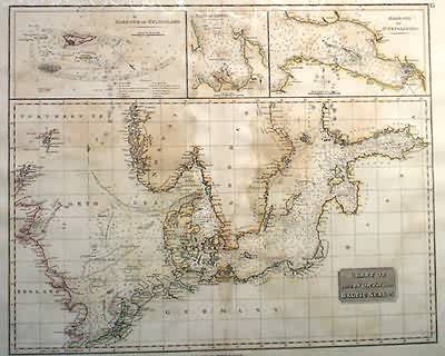 This map was made by John Thomson in 1827. A chart of the North and Baltic Seas is shown on this map. Cities along the coast, islands in the seas, and depth readings are shown. Insets show the Harbor of St.Petersburg, Port of Revel, and the Harbor of Heligoland.