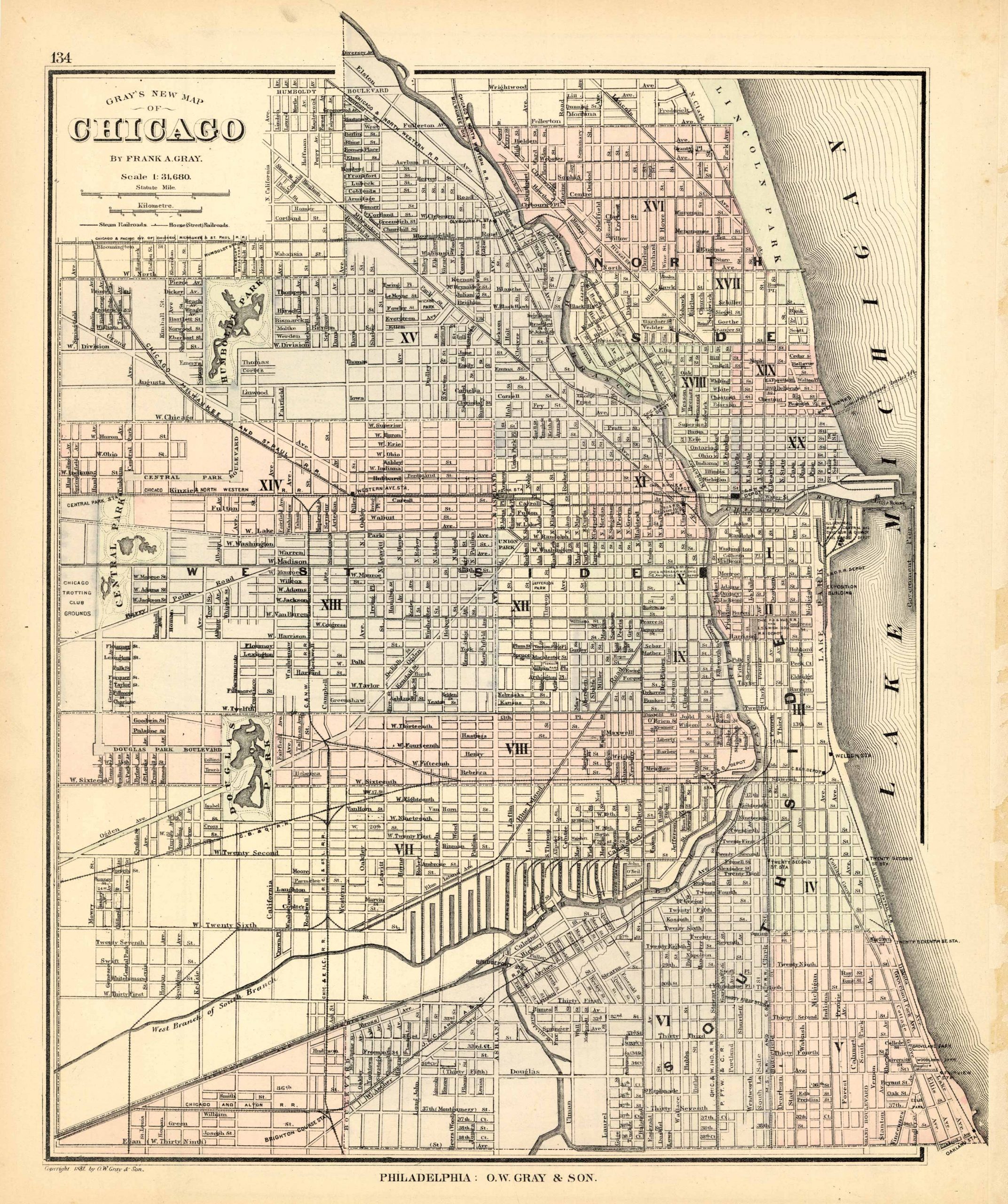This hand colored map was made by O.W.Gray and Son in 1882 for “The National Atlas”. The city of Chicago is illustrated on this map. Sections of the city are distinguished by bright pastel color. Other details include the names of streets, important parks, and illustrations of railroads and rivers.