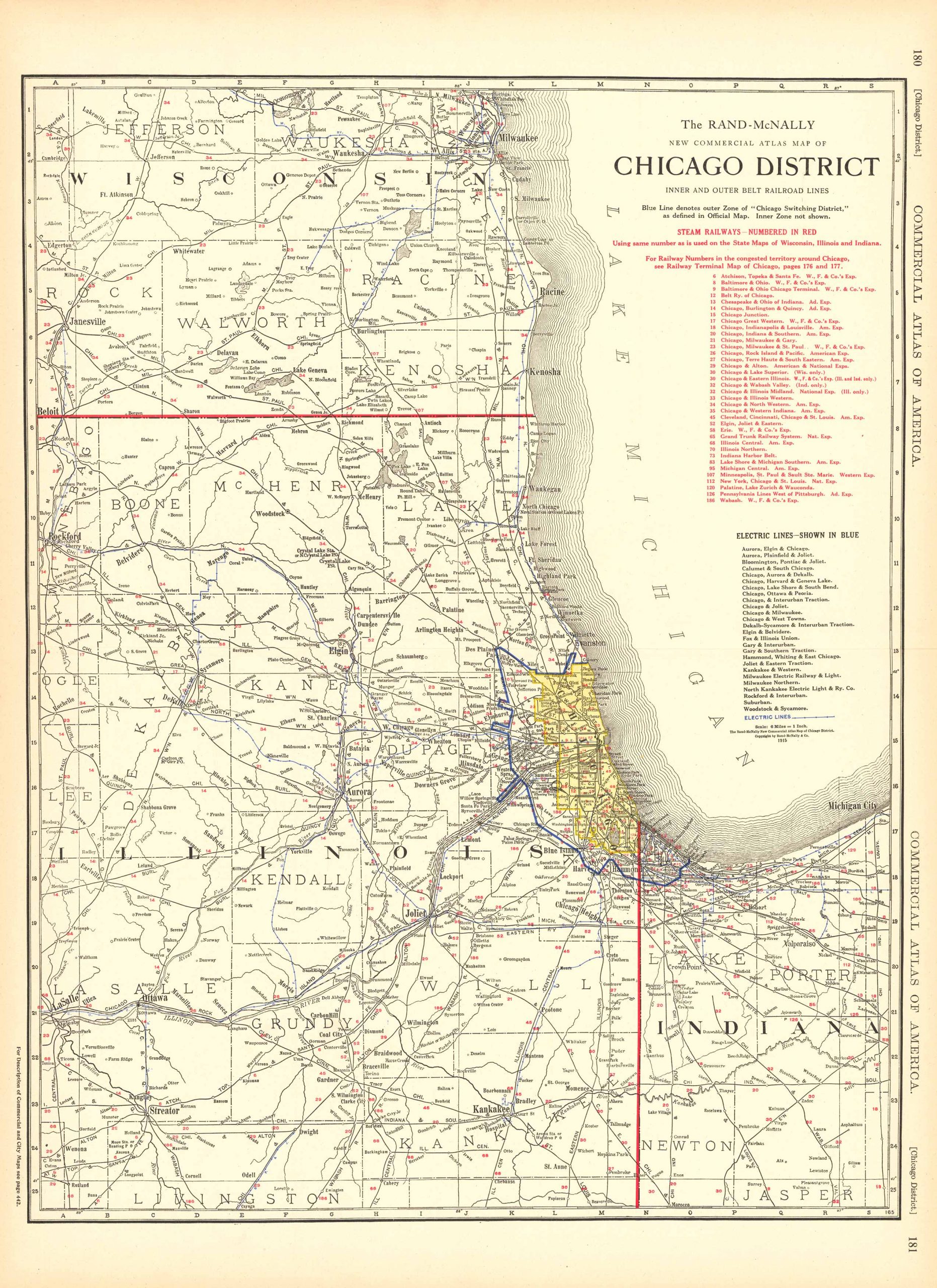 This map of the Chicago District Inner and Outer Belt Railroad Lines was produced by Rand McNally and Co. as part of its Commercial Atlas of America. These maps are some of our favorite maps because of the large size of each map. The detail shown on each map is exceptional because of the map size. These maps were intended to be used by business for shipping and other uses. Roads, railroads, rivers, and buildings are clearly shown. There is more detail on these maps than any others during this time period.