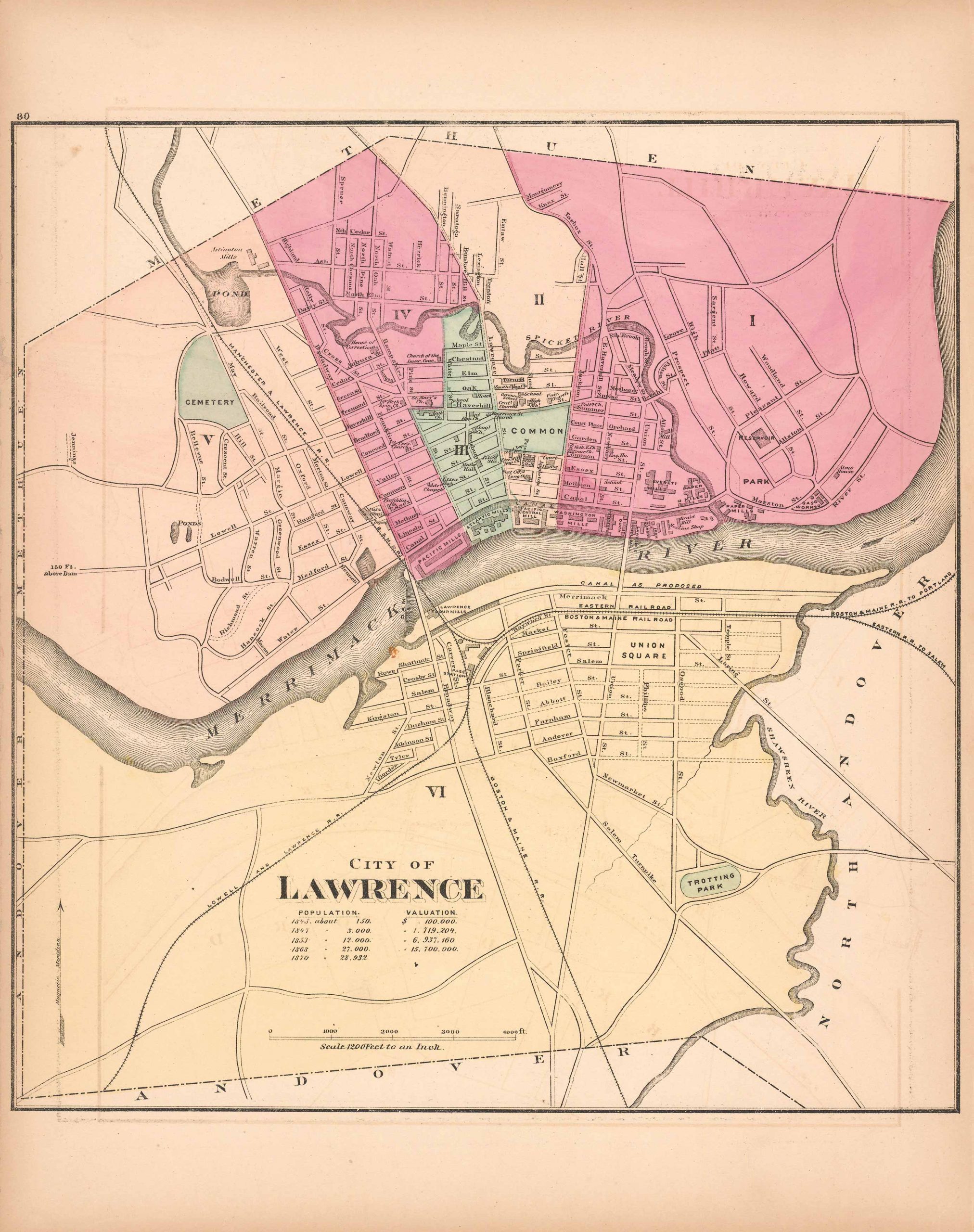 This hand colored map is from Walling and Grays Official Topographical Atlas of Massachusetts from Astronomical, Trigonometrical, and Various Local Surveys published in 1871. This bright pastel map of the City of Lawrence and its surrounding areas illustrates the street plan of the area. Details include rail lines, the names of neighborhoods,rail lines,lakes and rivers as well as important buildings.