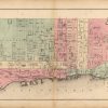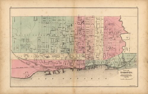 H. F. Walling made the maps in “Tackaburys Atlas of the Dominion of Canada” in 1875. These detailed, hand colored county maps show the names of counties and cities, rivers, lakes, important landmarks and the names of major land owners. The city of Toronto is illustrated on this beautiful pastel map.