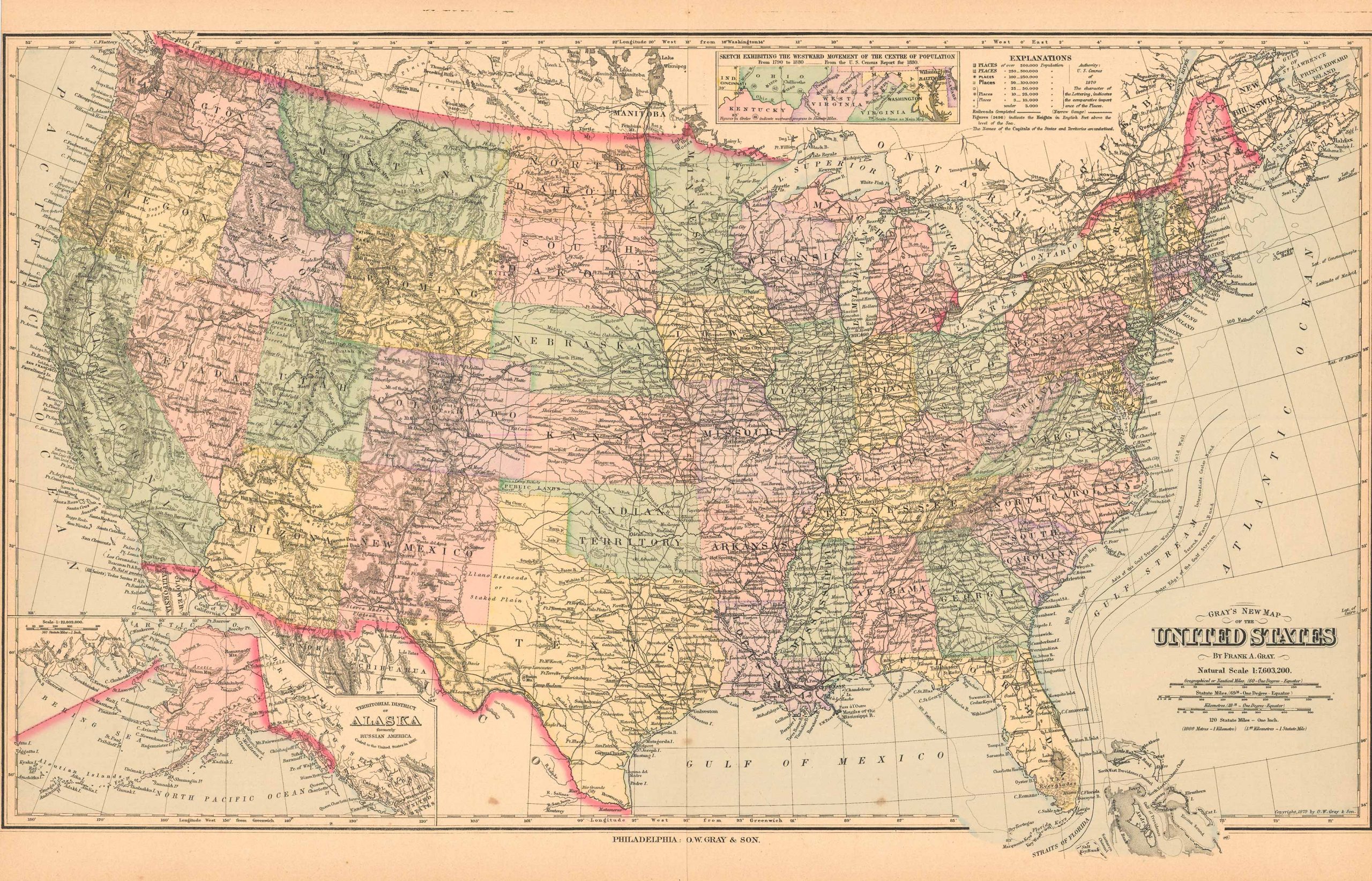 This hand colored map is from Stuarts Atlas of the State of Maine made in 1890 by J. H. Stuart & Co. The United States is illustrated on this double page map. Insets show Alaska and a sketch exhibiting westward movement. Pastel coloring and nicely aged paper make these maps great editions to the collections of residents interested in their local history.