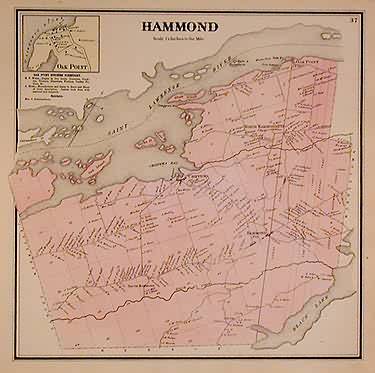 The “New Topographical Atlas of St. Lawrence County, New York” was made from the surveys of D. G. Beers, and published by Stone & Stewart in 1865. Each hand colored map illustrating a town in St. Lawrence includes abundant, historically significant details. The name of the town, streets, railroad lines, important buildings, the locations of property and the names of landowners, parks, rivers, and more relevant features are identified. This map shows the town of Hammond and its surroundings with an inset of Oak Point, as well as a list of local businesses.