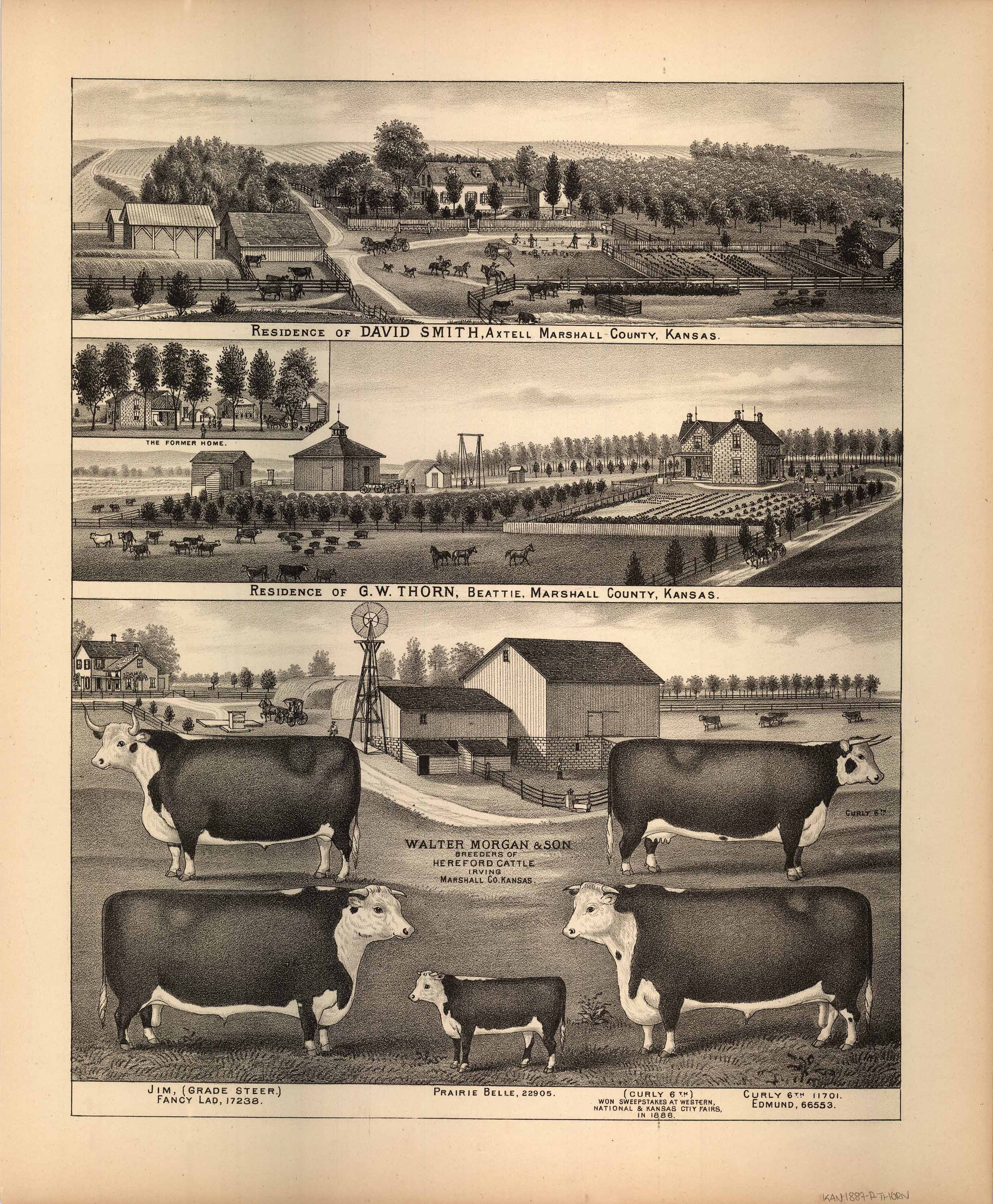 L.H. Evert’s 1887 Map of Residence of David Smith, Axtell Marshall County, Kansas. / Residence of G. W. Thorn, Beattie, Marshall County, Kansas. / Walter Morgan & Son Breeders of Hereford Cattle Irving Masshall Co. Kansas