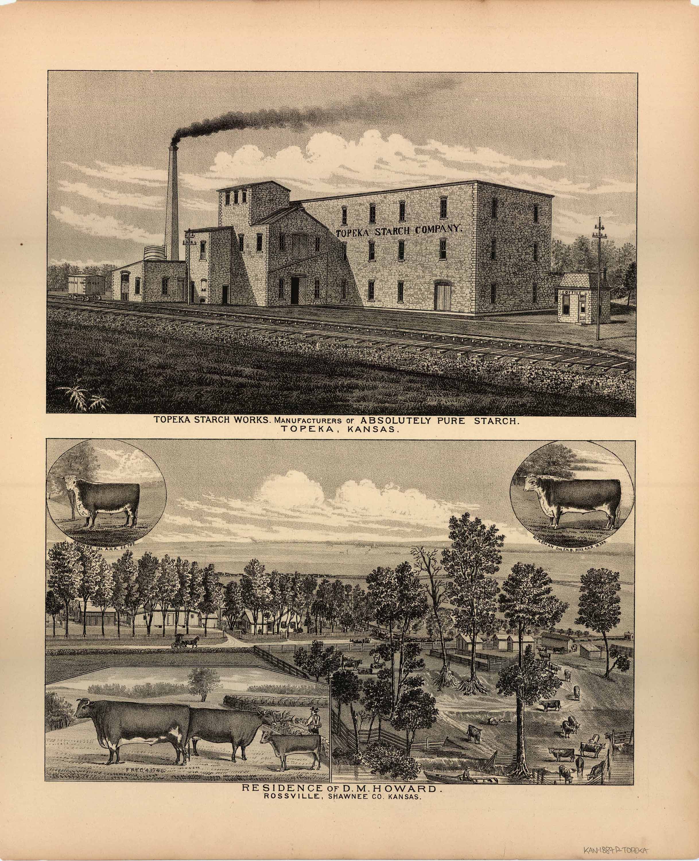 L.H. Evert’s 1887 Map of Topeka Starch Works. Manufacturers of Absolutely Pure Starch. Topeka, Kansas / Residence of D. M. Howard Rossville, Shawnee Co. Kansas