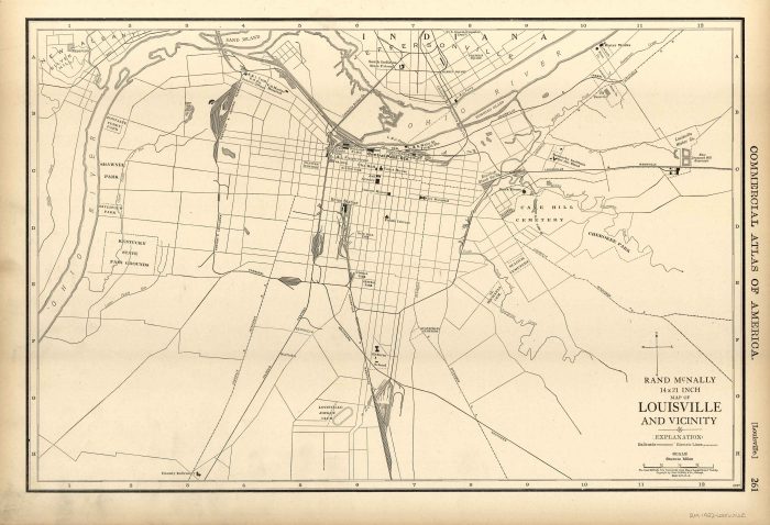 This map of Louisville was produced by Rand McNally and Co. as part of its Commercial Atlas of America. The detail shown on each map is exceptional because of the map size. These maps were intended to be used by business for shipping, etc. Roads, railroads, and rivers are clearly shown. There is more detail on these maps than any others during this time period.