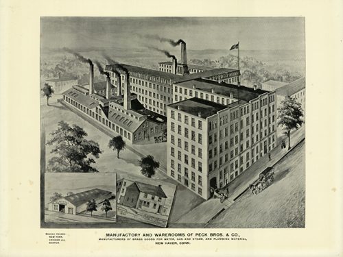 Manufactory and Warerooms of Peck Bros. and Co., Manufacturers of Brass Goods for Water, Gas, and Steam, and Plumbing Material, New Haven, Conn.