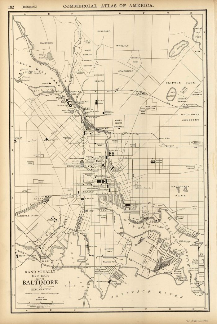 This map of Baltimore was produced by Rand McNally and Co. as part of its Commercial Atlas of America. The detail shown on each map is exceptional because of the map size. These maps were intended to be used by business for shipping, etc. Roads, railroads, and rivers are clearly shown. There is more detail on these maps than any others during this time period.