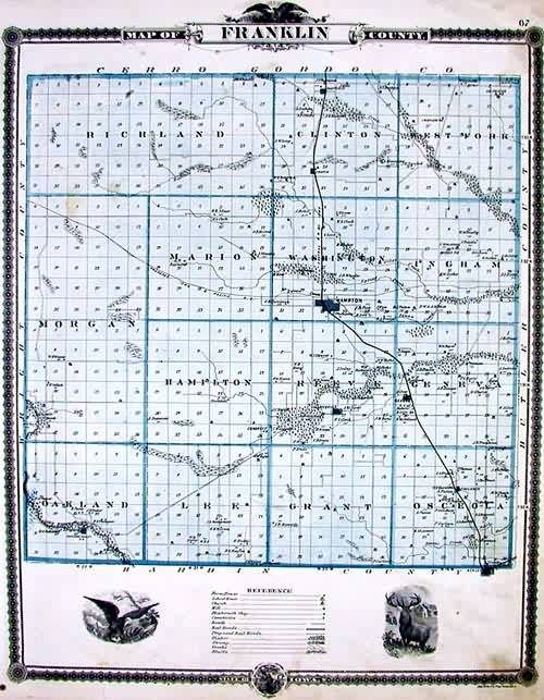 This map is from A.T. Andreas” Illustrated Historical Atlas of the State of Iowa, printed in 1875. This map is of Franklin County. Details include cities and towns, important landowners, rail lines, forests, important buildings, lakes, rivers and creeks. This local map would make a great gift for residents of the area.