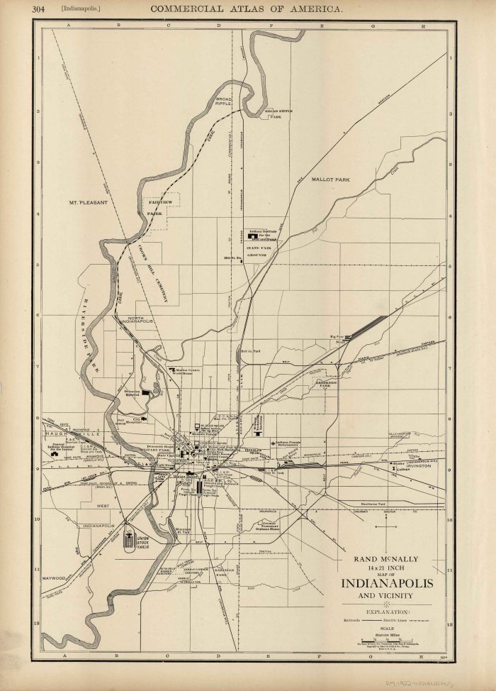 This map of Indianapolis was produced by Rand McNally and Co. as part of its Commercial Atlas of America. The detail shown on each map is exceptional because of the map size. These maps were intended to be used by business for shipping, etc. Roads, railroads, and rivers are clearly shown. There is more detail on these maps than any others during this time period.