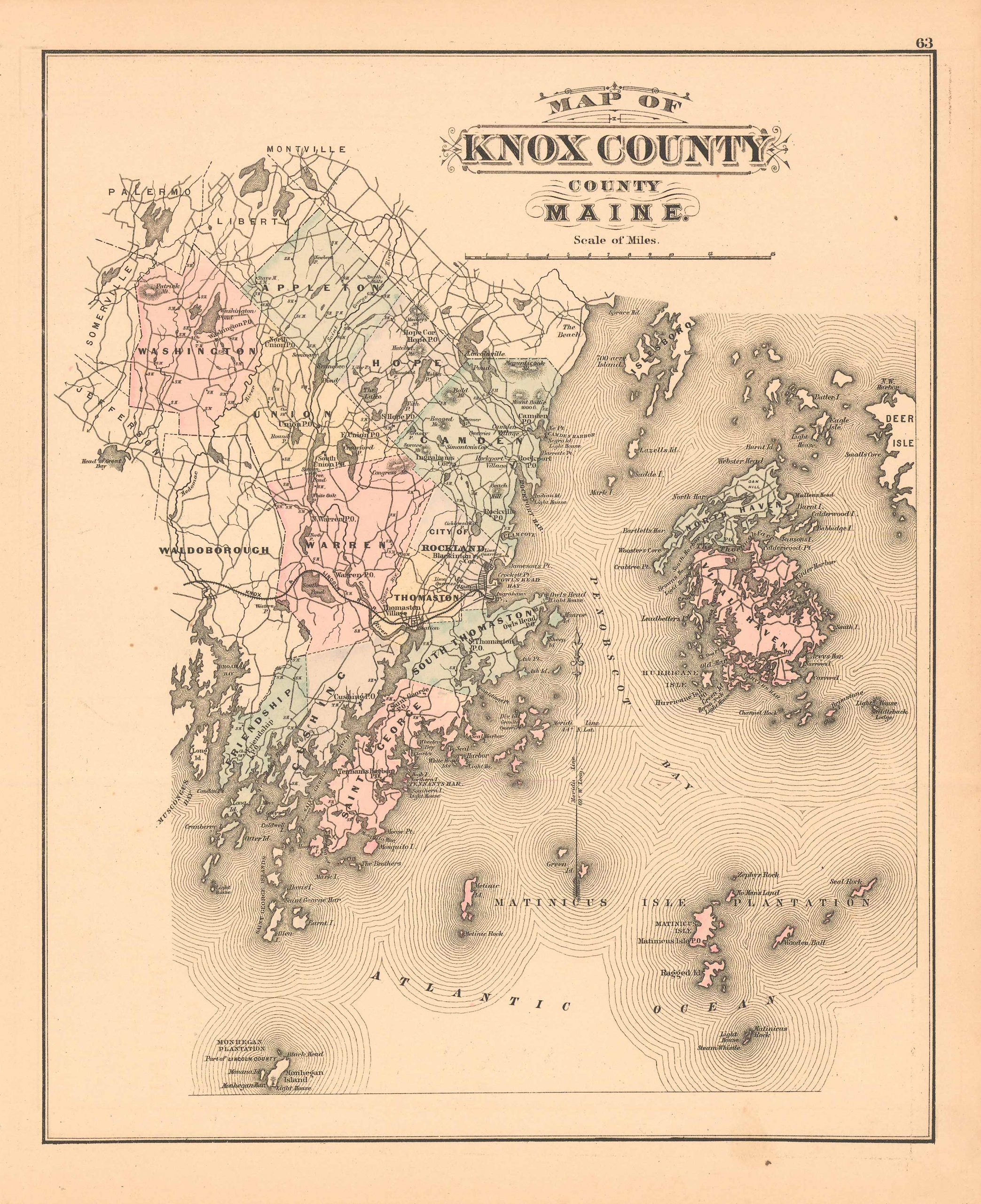 This beautiful, original hand-colored map of Knox County came from the “Atlas of the State of Maine” produced by George N. Colby & Co. in 1884. Colbys atlas and the maps therein were produced in limited numbers for a short time, making city and county maps of Maine difficult to locate. This detailed mapshows all roads (which are named), railroads, buildings and the business within, wards and or districts, schools, churches, hospitals, jails, cemeteries, parks, wharfs, ship yards, mills, the court house, halls and major manufacturing plants. A fantastic map if you live in the area or know someone who does.