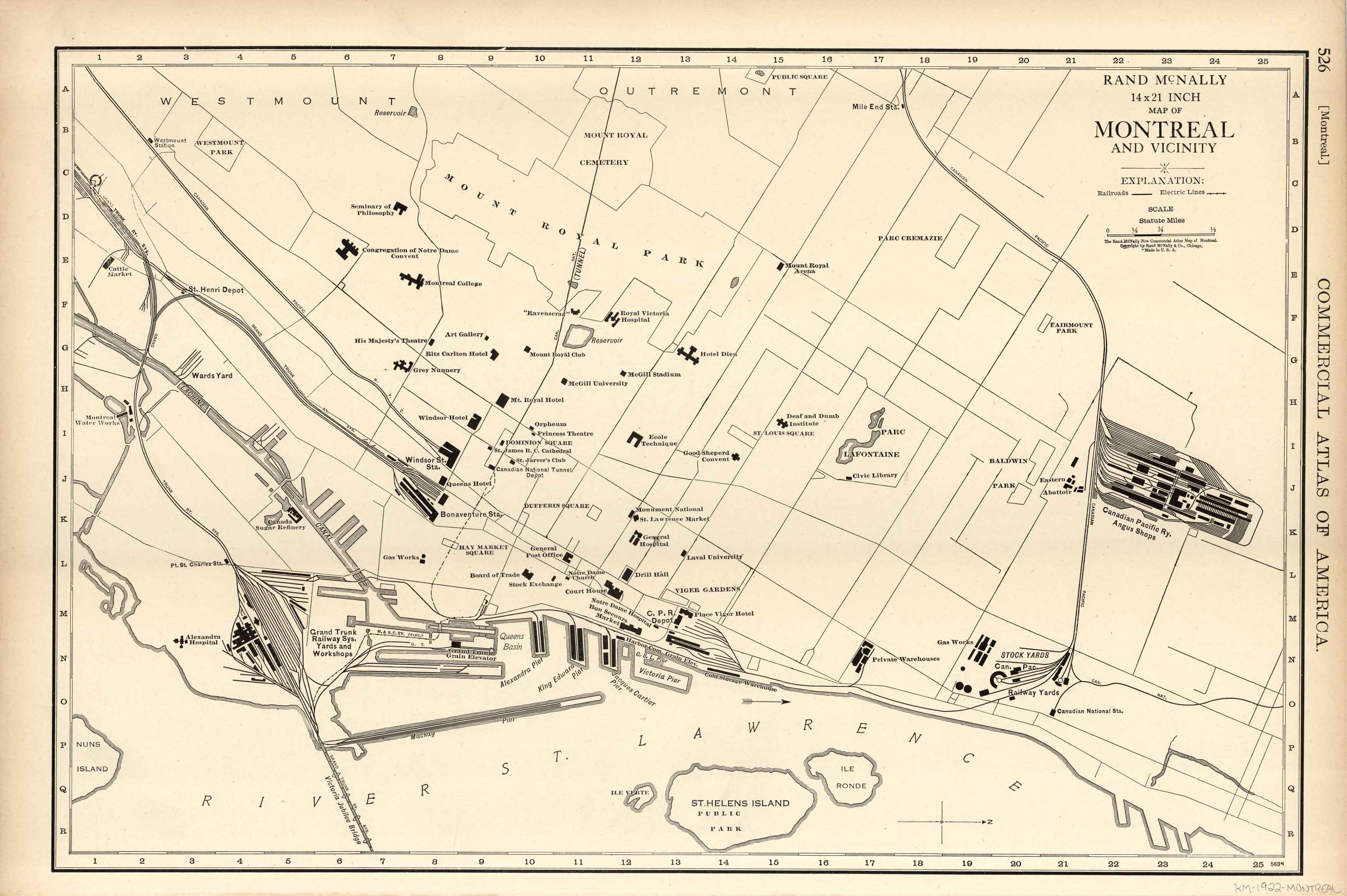 This map of Montreal was produced by Rand McNally and Co. as part of its Commercial Atlas of America. The detail shown on each map is exceptional because of the map size. These maps were intended to be used by business for shipping, etc. Roads, railroads, and rivers are clearly shown. There is more detail on these maps than any others during this time period.