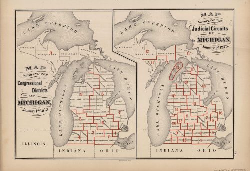 This beautiful map was originally published in “Tackaburys Atlas of the State of Michigan” in 1873. This map was published by George N. Tackabury, Detroit, Michigan. Tackabury was one of the U.S.s finest state and county map publishers. The maps within were drawn and compiled by Henry F. Walling. Each map has original hand coloring in beige, yellow, pink and green. The fine detail of this map shows cities, towns, rivers, lakes, post offices, roads, and most important, the existing railroad network. All railroads are labeled.